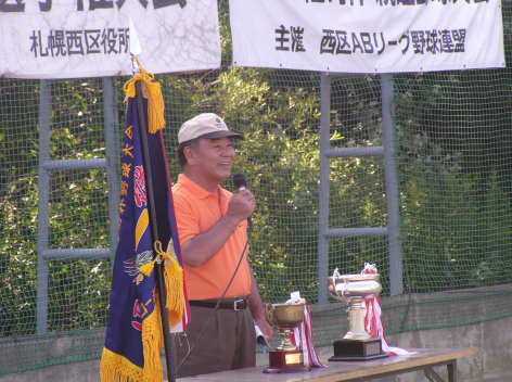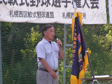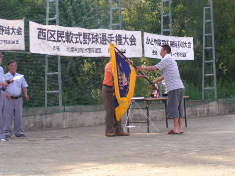 | レポート | 第7回かどや隆司杯の開会式が石狩市木工球場で行われた。 各チーム代表者による組み合わせ抽選会が行われ、前年度優勝チームの札幌マーシーズから優勝旗が返還された。 参加チーム全40チーム。今年も如何なる熱戦が繰り広げられるか− |