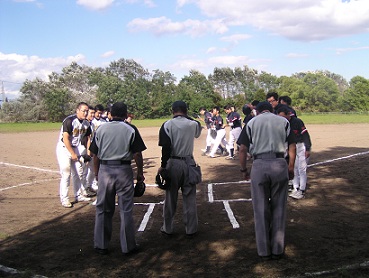 自ら招いたピンチを菊水寺島は続く3番若林の打球はピッチャー強襲のゴロ、これを捕球するとすかさず3塁送球、飛び出していた3塁走者をアウトにし、初回を無失点に抑える。