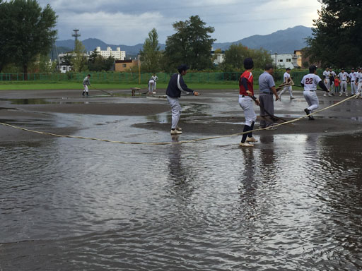 グラウンドは一時完全に冠水、雨は30分程で上がったものも、そのグラウンド状態から続行は困難とみられた。